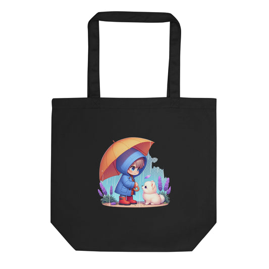 Duurzame Bondgenoten - Eco Tas met Kind & Pomeranian in Regen Illustratie