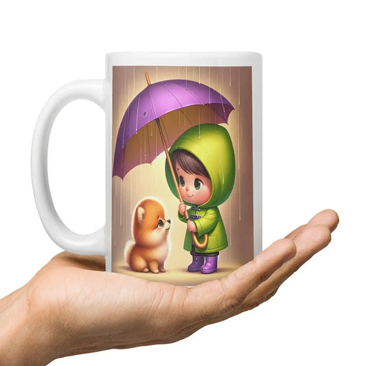 🎨 Paraplu Pomeranian Designer Mok met Kind in Regenjas